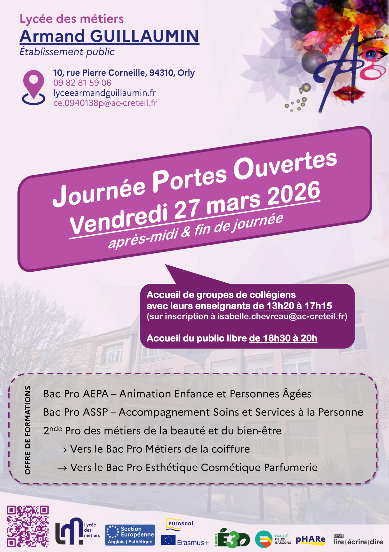 La journée "Portes Ouvertes" du lycée Armand Guillaumin d'Orly, pour la découverte des filières post-collège se déroulera le vendredi 27 mars 2026.