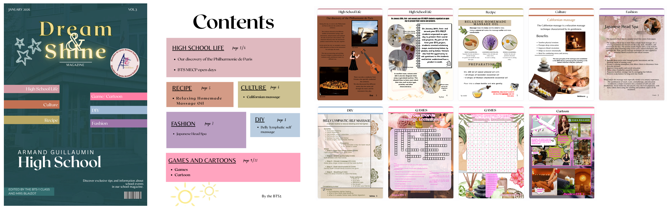 Cette publication a entièrement été réalisée par les étudiantes de la première année de BTS MECP, sur le thème du massage : nouvelles du lycée, culture, mode, recette, DIY, jeux, BD, tout tourne autour du massage et du bien-être.